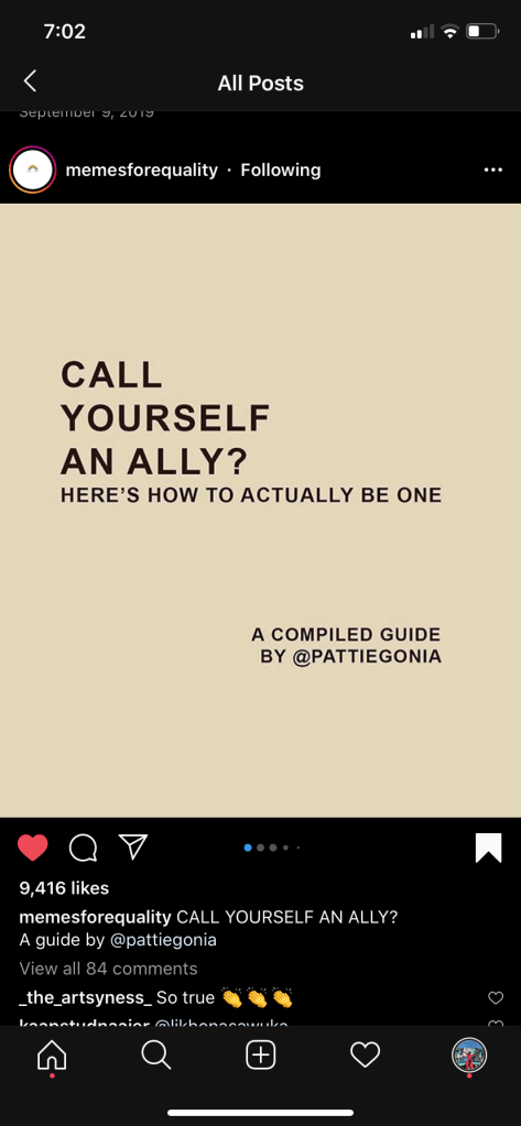 This page, as hinted by the name, is tackling the social problem of inequality through Instagram. They give you tips, tricks, and educational resources that affirm equality and equity, and denounce bigotry. They do not “cancel” folks through Instagram. Instead, they provide you with resources on how to do better, as pictured below. I have not looked through their comments and I do not have information on if they educate folks through the comments as well, but with a whopping 184K followers, I doubt there’d be much comment interaction.
