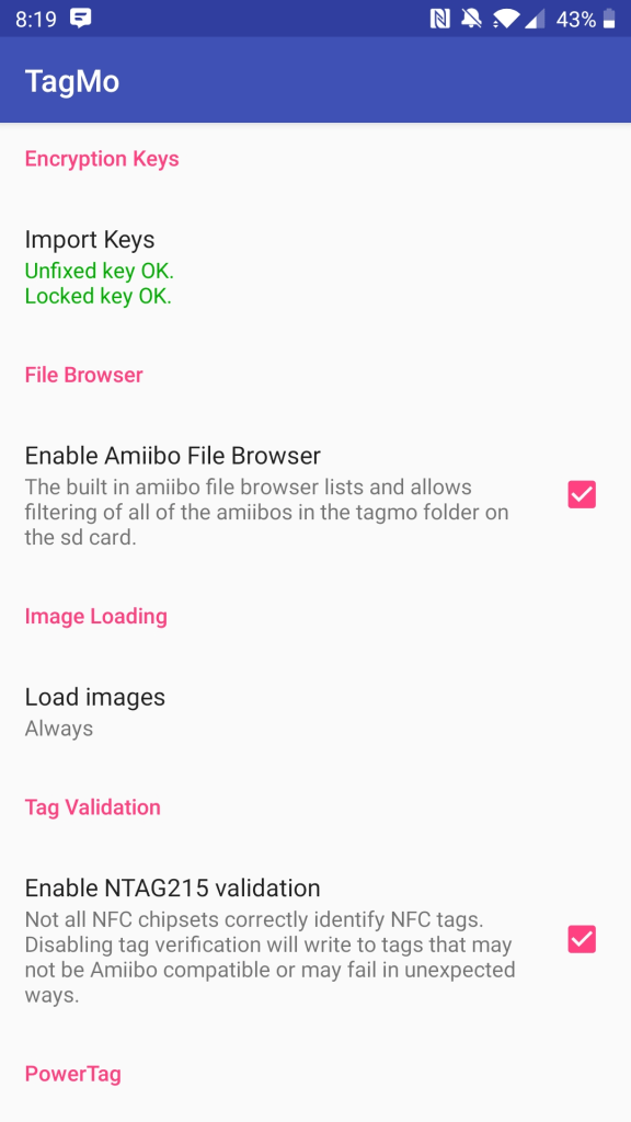 Personally, this reminds me of the TagMo app. The image below shows something that is very hard to use. For example, it doesn’t appear that the part under “Import Keys” is a button – but it is. This makes the app difficult to figure out and use effectively.